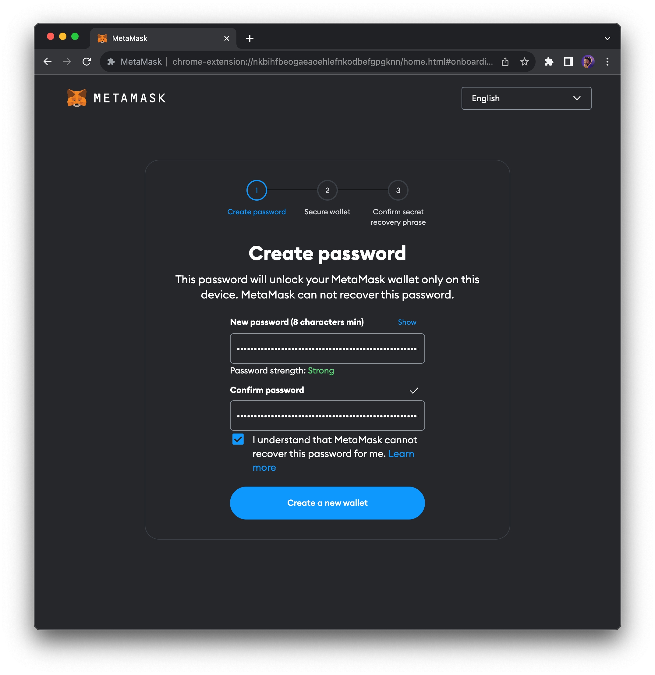 这会要求您首先设置密码。这是您打开 MetaMask 扩展程序时需要输入的密码: